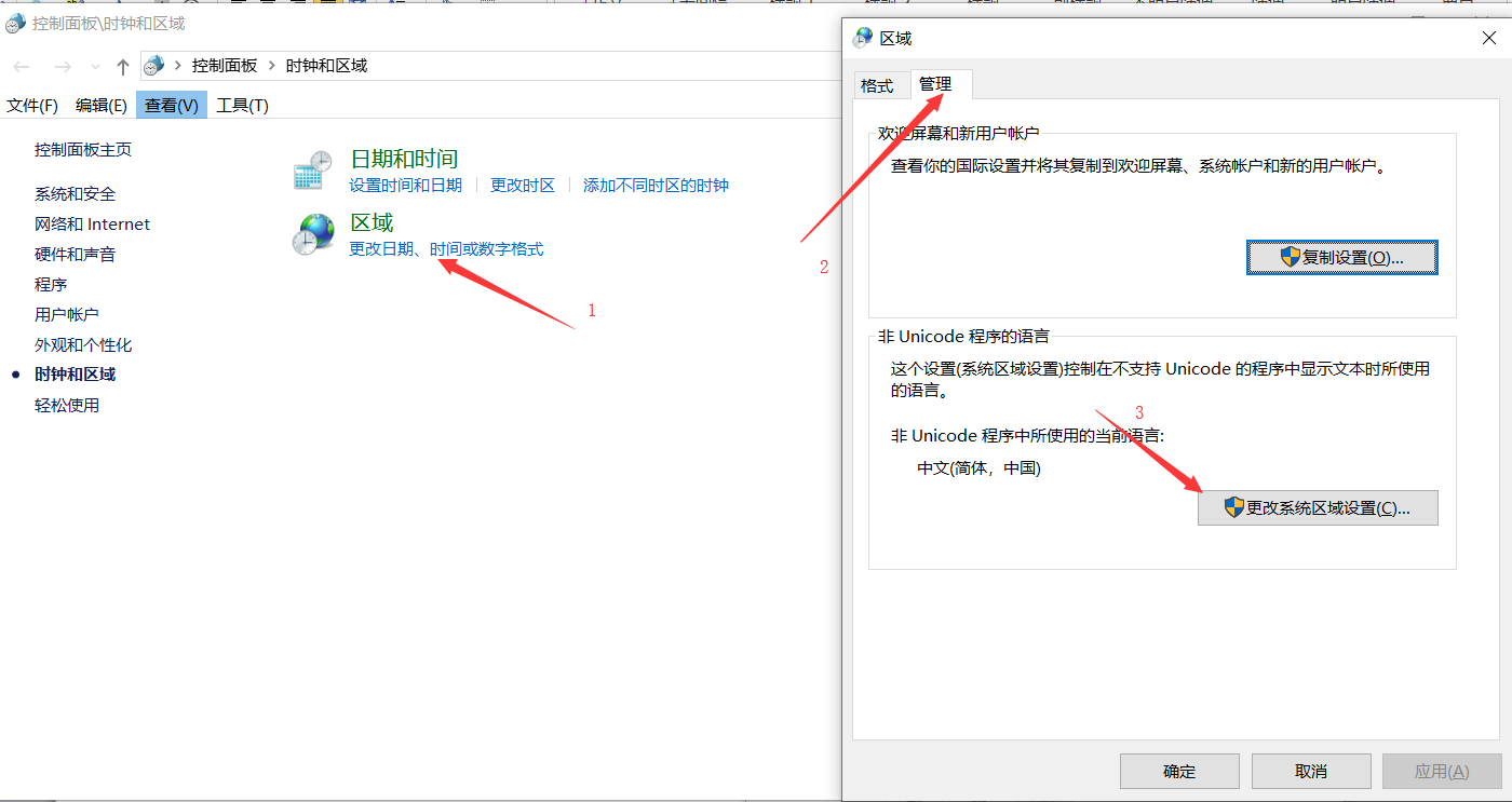 4. 选择更改日期, 时间或设置格式 - 选择管理页 - 更改系统区域设置